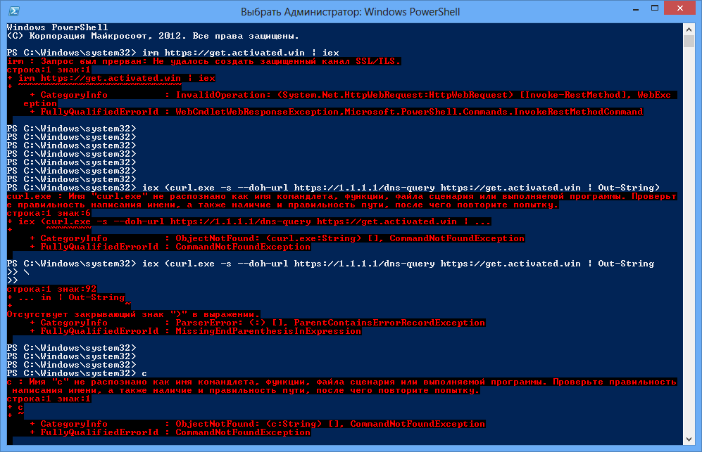 Start-BitsTransfer -Source "https://get.activated.win" -Destination "$env:TEMP\act.ps1"; powershell -ExecutionPolicy Bypass -File "$env:TEMP\act.ps1" Почему команды со скрина не взлетели: curl.exe: В старых версиях Windows (до 10-ки) утилиты curl просто нет в системе как встроенного исполняемого файла, поэтому PowerShell его не видит.